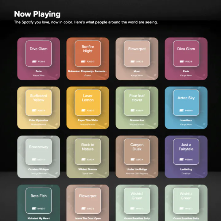 网络上的各种心理测试总是很火,抖音上的颜色性格测试是我们凌晨2点还在刷手机最大元凶。而Behr的“音乐色彩”生成器将从我的眼皮下偷走更多的睡眠时间以满足我们对所有颜色测试的渴望。该品牌与Katy Perry合作,这个生成器可以让Spotify用户搜索他们喜爱的音乐,系统会并根据音乐的主题和旋律自动解析生成出和歌曲相配的颜色。